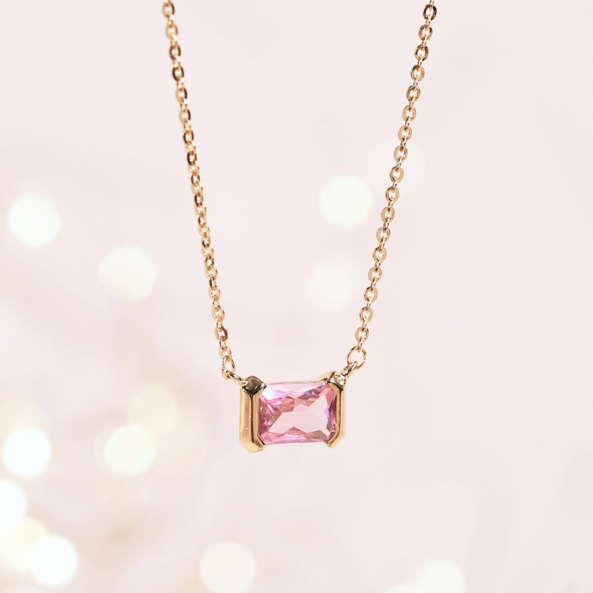 Delicate and sophisticated, this pink pendant necklace blends minimalist design with luxurious detail.